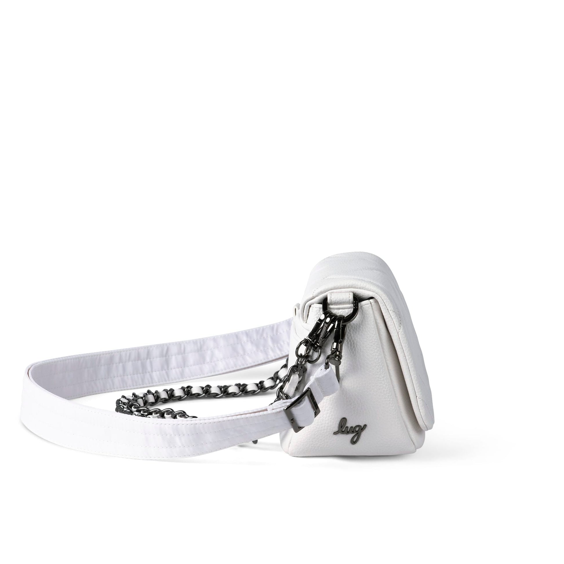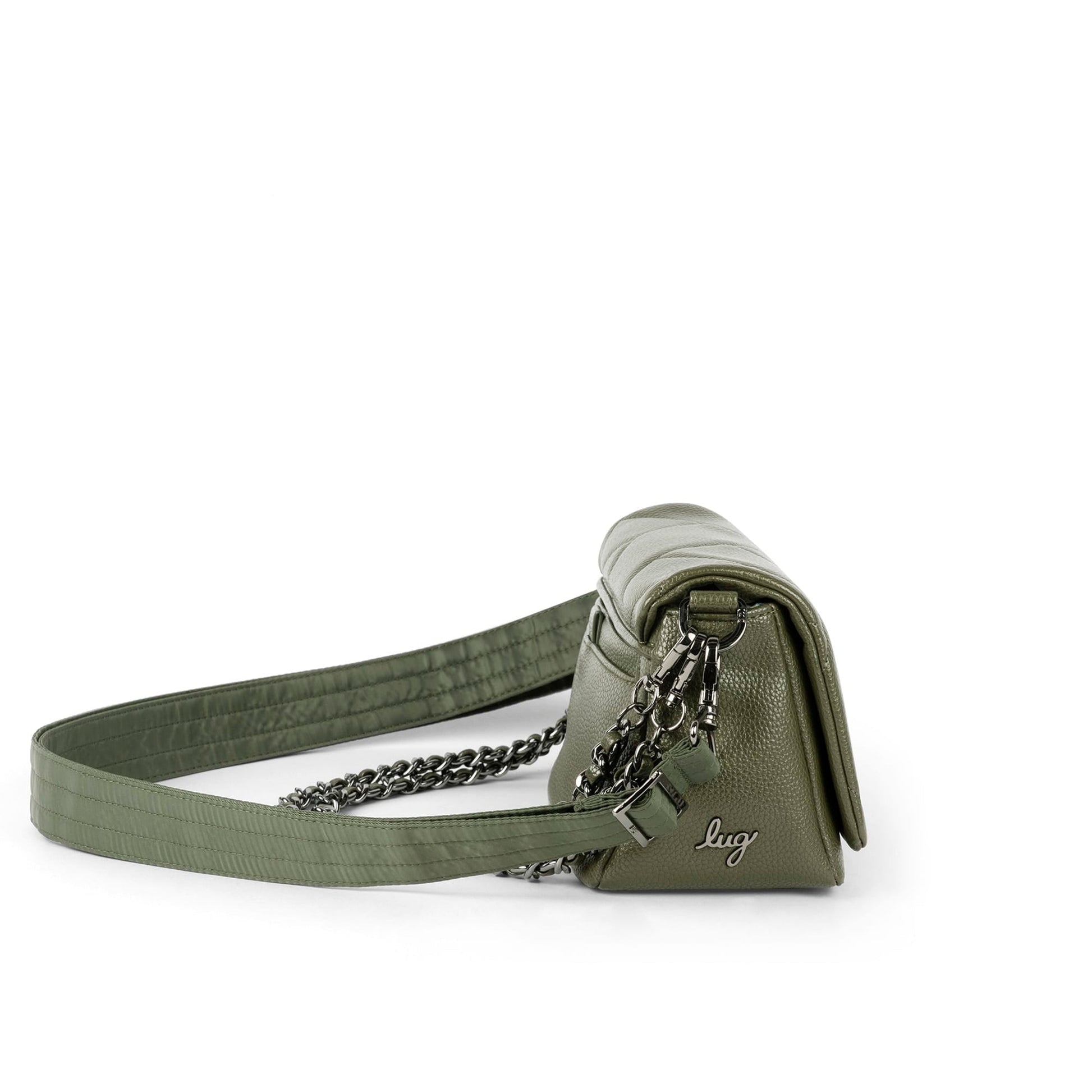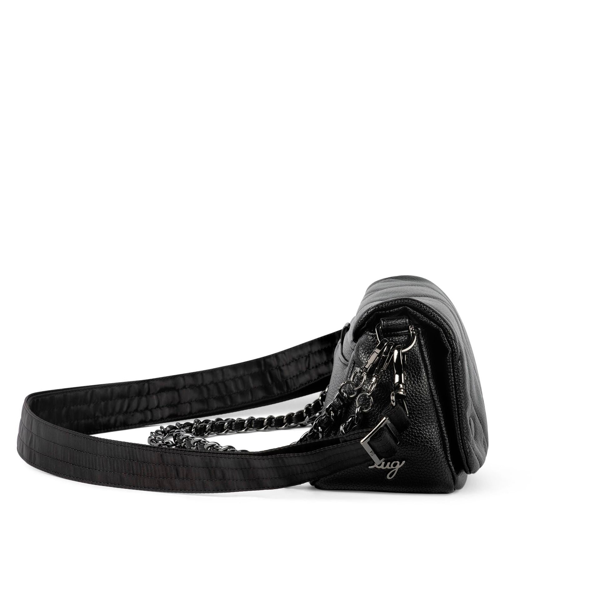 Our Piccolo VL is so stylish we can't stand it. It has one main compartment with a fold over magnetic flap, removable crossbody fabric strap, removable crossbody gunmetal chain strap with woven leather, soft-lined cell phone slip pocket, and more. It also has a patterned lining on the inside — for that extra Lug touch.