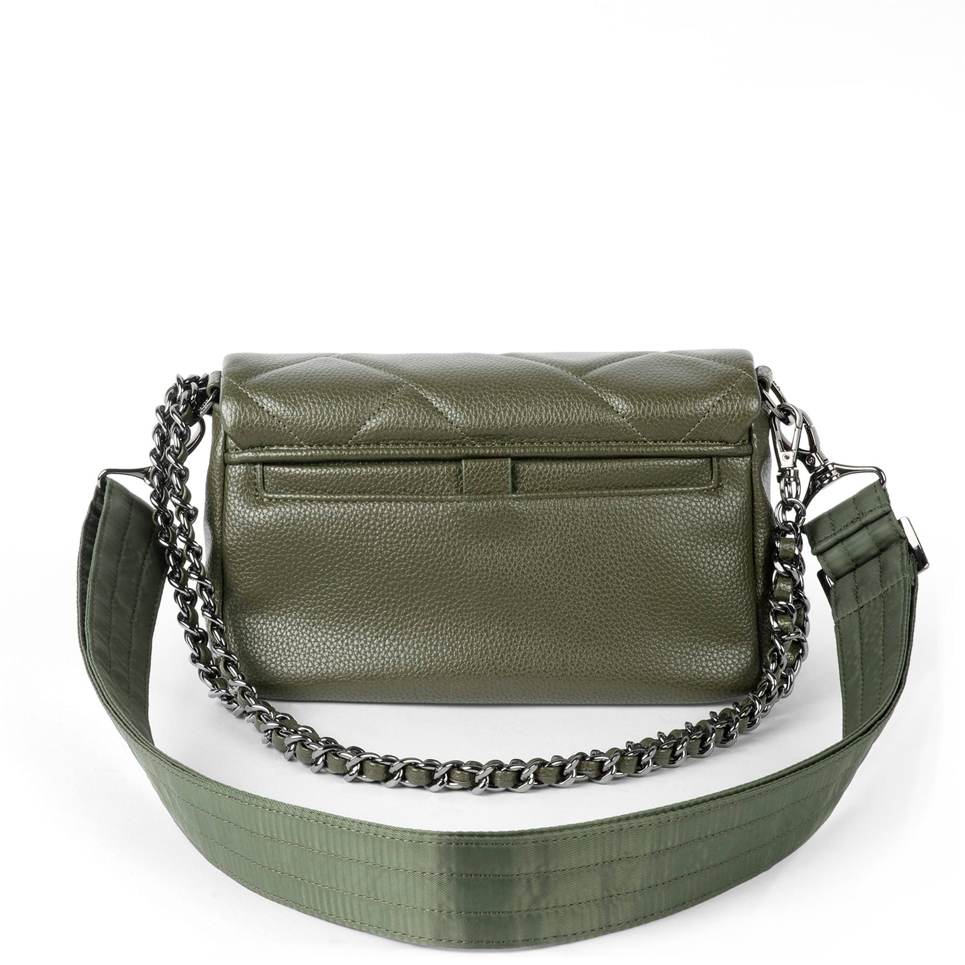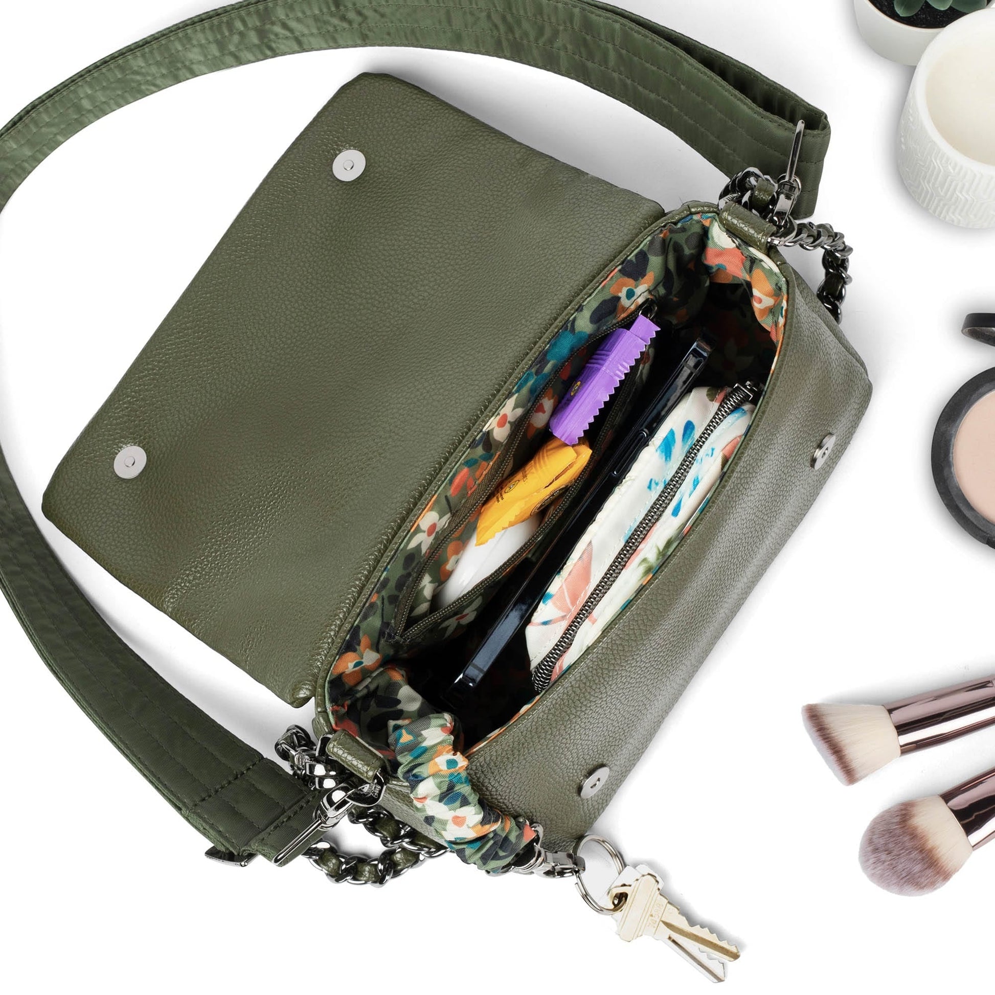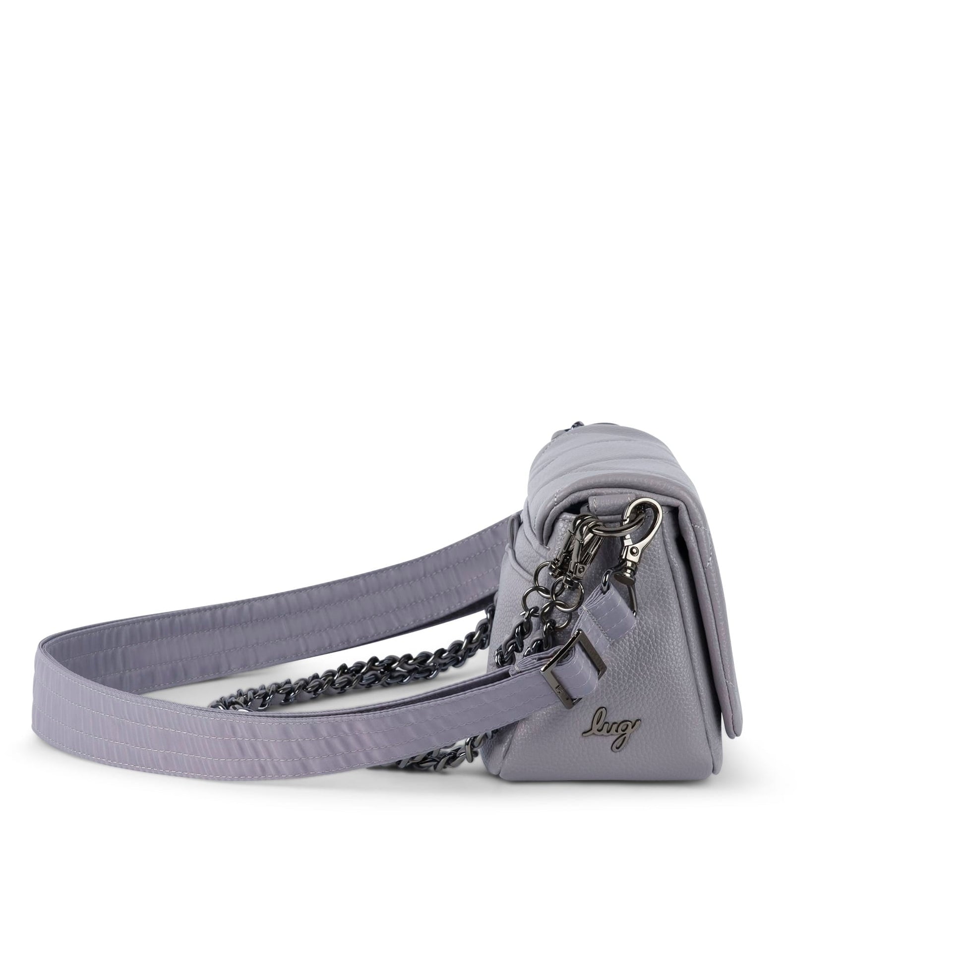 Our Piccolo VL is so stylish we can't stand it. It has one main compartment with a fold over magnetic flap, removable crossbody fabric strap, removable crossbody gunmetal chain strap with woven leather, soft-lined cell phone slip pocket, and more. It also has a patterned lining on the inside — for that extra Lug touch.