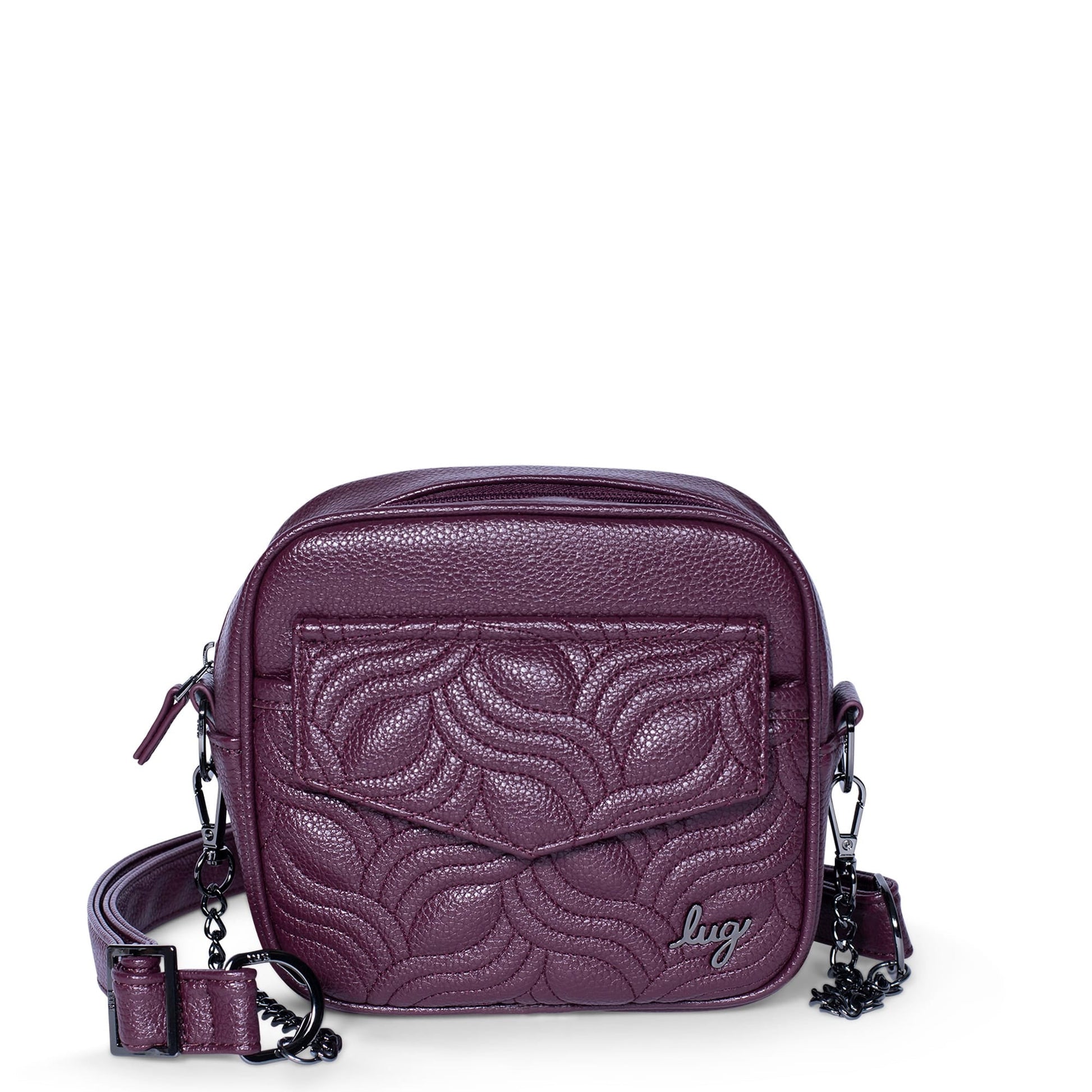 - Adjustable and removable crossbody strap with gunmetal chain